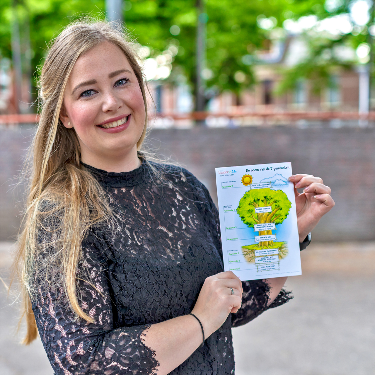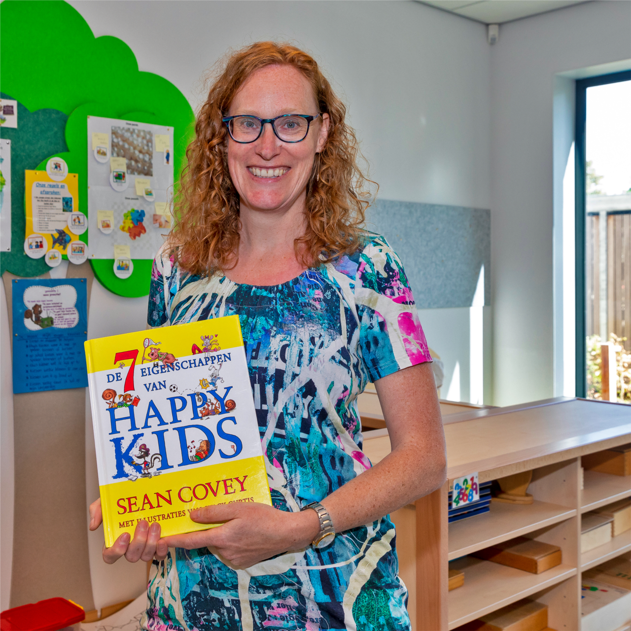 Omdat dit misschien wat zweverig klinkt, geeft Christel een korte, praktische omschrijving van de 7 gewoonten. ‘Via verhalen uit het boek “De 7 eigenschappen van Happy Kids” en de daarbij horende handpoppen maken de kinderen kennis met de 7 gewoonten. In de onderbouw ligt de nadruk op de eerste 3 gewoonten, die vooral betrekking hebben op het kind zelf. 1. Wees proactief en neem initiatief. Als je drinkbeker omvalt, roep je niet de juf, maar ga je zelf opruimen. 2. Begin de dag met een einddoel in gedachten en maak een plan om daar te komen. 3. Belangrijke zaken eerst, dus eerst werken, dan spelen. In de midden-en bovenbouw leren de kinderen naast de eerste 3 gewoonten om meer rekening te houden met het groepsbelang. Gewoonte 4 luidt: denk win-win en zoek naar voordeel voor iedereen. 5. Luister eerst naar een ander, voordat je zelf gaat praten. 6. Creëer synergie, want samen bereik je meer. En 7. Houd de zaag scherp, wat betekent dat je ook aan jezelf moet denken door af en toe een pas op de plaats te maken. En natuurlijk vieren we successen samen.’ Terwijl Christel uitleg geeft over de gewoonten, verschijnt er een glimlach van oor tot oor op haar gezicht. ‘Dat komt omdat ik echt enthousiast ben over deze aanpak.’